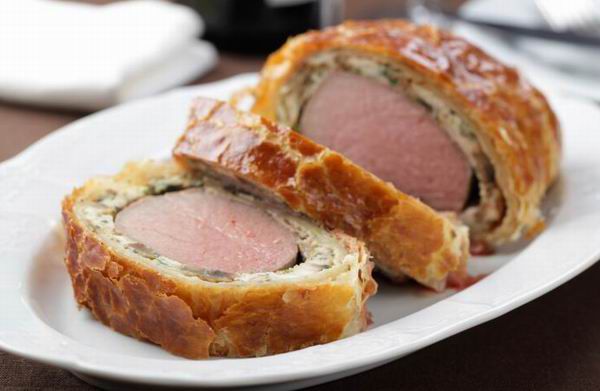 Wellington: bélszín esetén gombapéppel leveles tésztában megsütve, Madeira-mártással tálalva